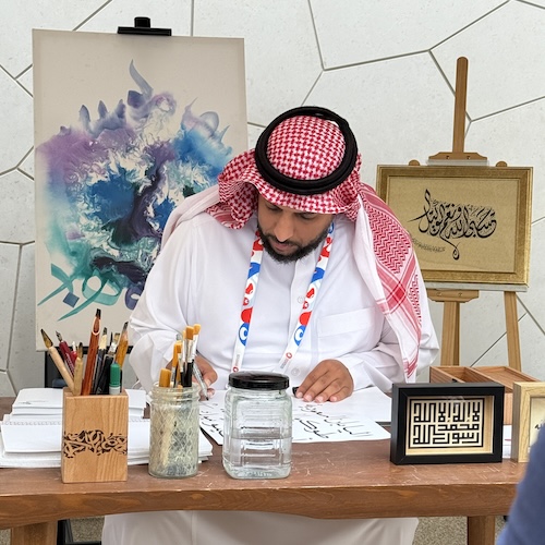真ん中の広場でちょうどアラビア書道のショーをやってた。日本の書道と同じで墨汁を使う