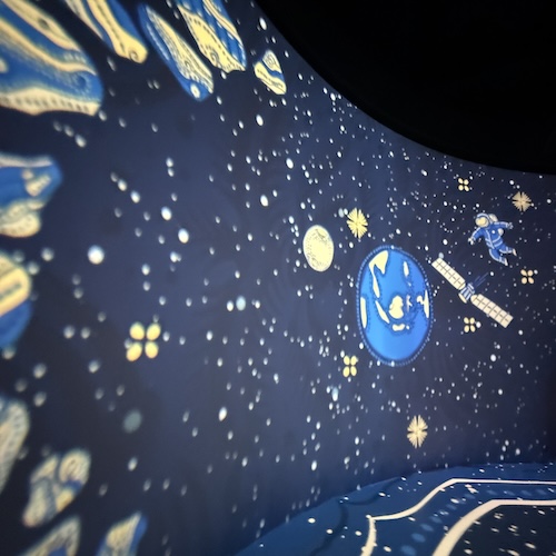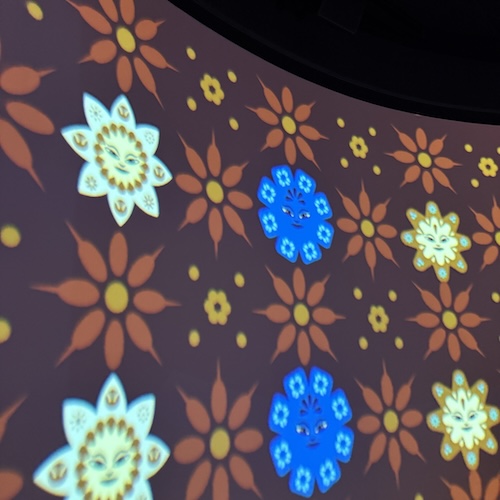 次の部屋はインドネシアの自然や文化の映像、アニメ。顔と手足がついた太陽はマスコットの